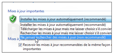 4- Déroulez la liste Mises à jour importantes et sélectionnez l’option Ne jamais rechercher des mises à jour.